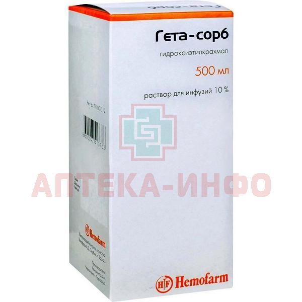 Гета-сорб раствор для инфузий 6% и 10% - препарат ГЭК (пентакрахмал) со средней молекулярной массой 200 тыс. дальтон и степенью замещения около 0,5. За счет способности связывать и удерживать воду обладает волемическим действием - способностью увеличивать объём циркулирующей крови на 85-100 и 130-140% от введенного объёма для 6 и 10% раствора соответственно (плазмозамещающее действие устойчиво сохраняется в течение 4-6 ч). Восстанавливает нарушенную гемодинамику, улучшает микроциркуляцию, реологические свойства крови (за счет снижения показателя гематокрита), уменьшает вязкость плазмы, снижает агрегацию тромбоцитов и препятствует агрегации эритроцитов. Сходство структуры гидроксиэтилкрахмала со структурой гликогена объясняет высокий уровень переносимости и практическое отсутствие побочных реакций.