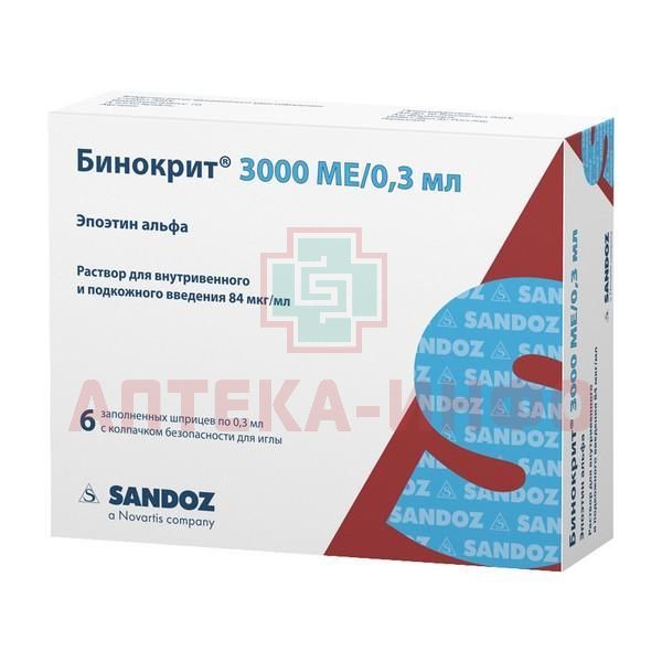Бинокрит шприц (р-р д/в/в и подкожн. введ.) 84мкг/мл (3000МЕ/0,3мл) 0,3мл №6 IDT Biologika GmbH/Германия