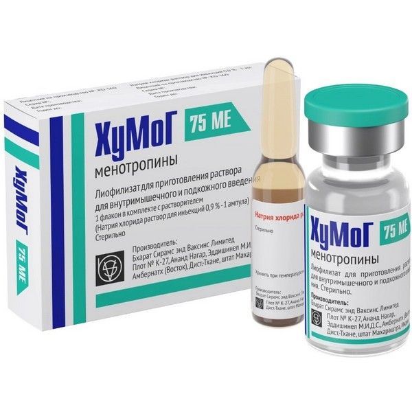 - Лиофилизат для приготовления раствора для внутримышечного и подкожного введения, 75 ME ЛГ+75 ME ФСГ лиофилизата один флакон + растворитель - 1 мл -1 ампула вместе с инструкцией по применению в уп.