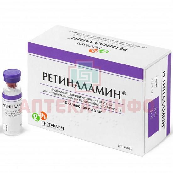 Активное вещество: ретиналамин (комплекс водорастворимых полипептидных фракций сетчатки глаз скота) 5 мг,