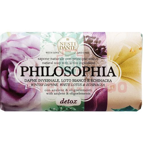 Косметическое банное мыло PHILOSOPHIA Детокс от Nesti Dante содержит экстракты волчника душистого, белого лотоса и эхинацеи. Это растительное мыло сделано вручную, не содержит в своем составе щелочи, не сушит и не раздражает кожу, хорошо пенится.