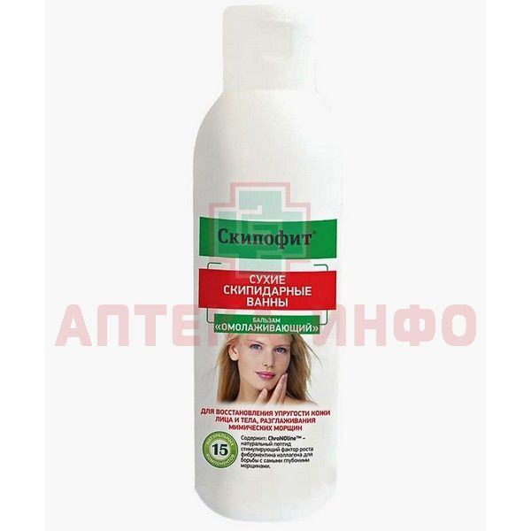 - Бальзам «Омолаживающий» сухие скипидарные ванны Скипофит - комплексное косметическое средство с активным стимулирующим действием против дряблости кожи, разглаживания мимических морщин, повышения тургора и насыщения влагой. Способствует омоложению кожи, помогает подтянуть овал лица.