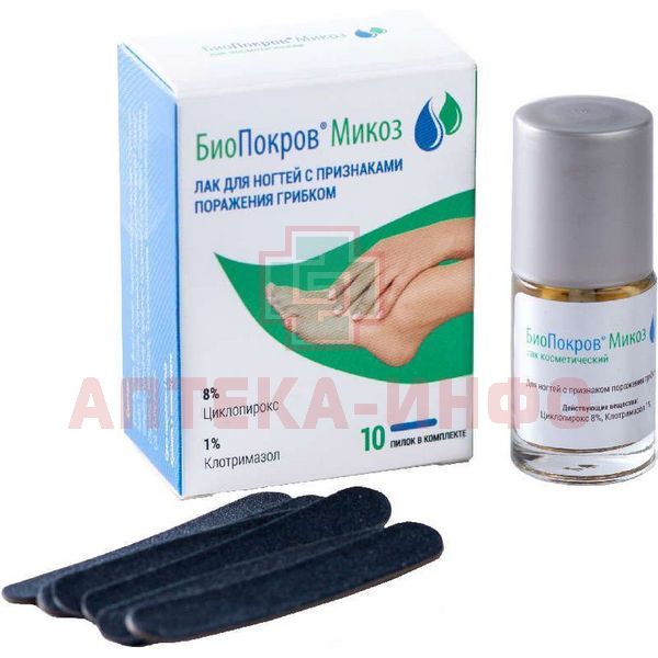 Циклопирокс (Ciclopirox) обладает широким спектром противогрибкового (фунгицидного) действия. Эффективен при местном применении в отношении дерматомицетов, дрожжеподобных грибов, плесеней и других видов грибов. Активен в отношении основных возбудителей онихомикозов, в т. ч. Trichophyton rubrum, Epidermophyton floccosum, Candida albicans, Scopulariopsis brevicaulis, Microsporum canis, Malassezia furfur, отдельных штаммов бактерий (как грамположительных, так и грамотрицательных). Повреждает клеточную стенку гриба и блокирует транспорт ионов калия, фосфатов, аминокислот. Лак применяют для лечения и профилактики грибковых инфекций, вызванных чувствительными к препарату грибами: микозы ногтей (онихомикозы). В виде лака для ногтей быстро (в течение первых часов с момента нанесения) и глубоко проникает в ноготь и длительно депонируется в месте инфекции, лак образует физический барьер, препятствующий реинфекции.