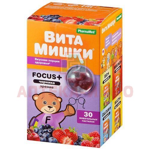 ВитаМишки Focus+ рекомендуется детям с 3-х лет в качестве биологически активной добавки к пище дополнительного источника витаминов А, В2, Е, бета-каротина, минерала цинка и селена