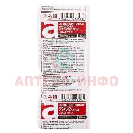 Аскорбиновая кислота с глюкозой таб. 60мг №10 Квадрат-С