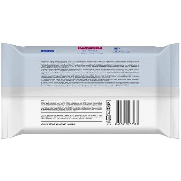 - PREMIAL САЛФЕТКИ ВЛАЖНЫЕ УНИВЕРСАЛЬНЫЕ - предназначены для гигиены рук и тела.