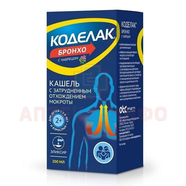 Комбинированный препарат для лечения кашля, оказывает муколитическое и отхаркивающее действие, а также обладает противовоспалительной активностью. Действие эликсира Коделак Бронхо с чабрецом обусловлено фармакологическими свойствами его компонентов: амброксол обладает секретомоторным, секретолитическим и отхаркивающим действием, нормализует нарушенное соотношение серозного и слизистого компонентов мокроты, увеличивает секрецию сурфактанта в альвеолах. Уменьшает вязкость мокроты и способствует ее отхождению;