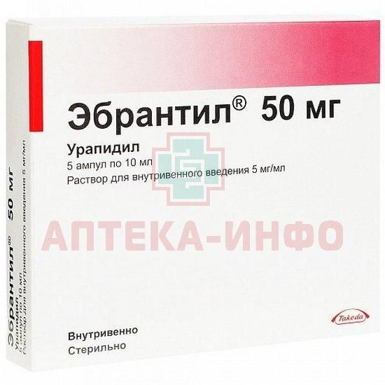 Эбрантил® относится к препаратам, блокирующим постсинаптические альфа-1-адренорецепторы, благодаря чему снижается периферическое сопротивление. Кроме того, Эбрантил® регулирует центральный механизм поддержания сосудистого тонуса и обладает слабым бета-адреноблокирующим действием. Частота сердечных сокращений (ЧСС), сердечный выброс при его введении не меняются. Низкий сердечный выброс может повышаться за счет снижения сосудистого сопротивления. Ортостатических явлений, как правило, Эбрантил® не вызывает. Эбрантил® блокирует вазоконстрикцию, вызываемую альфа-2-адренорецепторами, и не вызывает рефлекторной тахикардии, обусловленной вазодилатацией. Эбрантил® сбалансированно снижает систолическое и диастолическое артериальное давление (АД), уменьшая периферическое сопротивление и не вызывает рефлекторной тахикардии. Урапидил снижает пред- и постнагрузку на сердце, повышает эффективность сердечного сокращения, тем самым, при отсутствии аритмии, препарат увеличивает сниженный минутный объем сердца.