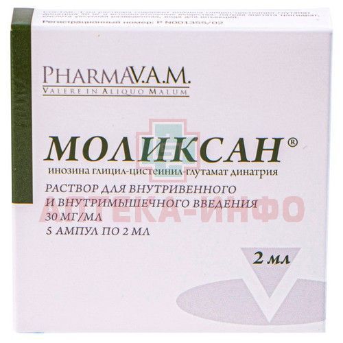 - Моликсан® представляет собой органическую соль, включающую инозин (пуриновый компонент) и глицил-цистеинил-глутамат (пептидный компонент) в соотношении 1:1. Моликсан® регулирует тиол-дисульфидный обмен гепатоцитов, индуцирует экспрессию ферментов первой и второй фаз детоксикации ксенобиотиков, подавляет репликацию ДНК и РНК вирусов, вызывающих гепатиты В и С, стимулирует продукцию интерферонов и макрофагами печени, интерлейкина-2 Т-лимфоцитами. Цитопротекторная и иммуномодулирующая активности препарата Моликсан® приводят к ингибированию цитолиза гепатоцитов, разрешению воспалительного процесса при токсических и вирусных поражениях клеток печени. Пептидный и пуриновый компоненты препарата Моликсан® опосредованно влияют на метаболизм, процессы пролиферации, дифференцировки и апоптоза клеток печени, способствуя восстановлению нормальной структуры печеночной ткани. Препарат обладает иммуномодулирующим, противовирусным, гепатопротекторным кардипротекторным и нейропротекторным действием.