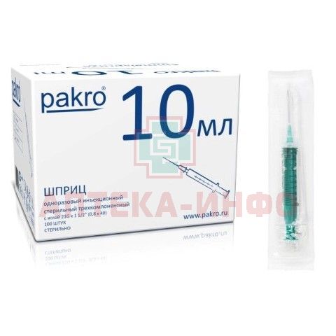 - PAKRO Шприц одноразовый, стерильный трёхкомпонентный, объёмом 10 мл, c иглой 0,8х40мм (21G)