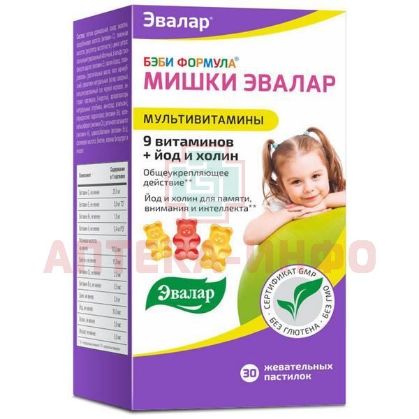 Пастилки «Бэби Формула Мишки Мультивитамины» от компании «Эвалар»: Отличаются качественным составом: созданы на основе европейских ингредиентов высокого качества. Содержат в составе натуральный сок (яблочный). Полное отсутствие искусственных красителей, ароматизаторов и консервантов. Без глютена и ГМО. Усиленный состав: богатый набор витаминов усилен минералами. Приятный вкус: детям нравятся мармеладные витаминки с фруктовым вкусом. Выгоднее по цене на 70 % по сравнению с импортным аналогом1. Высокое качество гарантировано международным стандартом GMP. Бэби Формула Мишки Мультивитамины получили Знак Качества «Лучшее - детям»2. Выпускаются как в маленькой (30 пастилок), так и в экономичной большой упаковке (60 пастилок).
