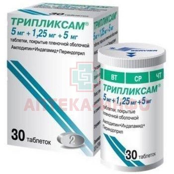 - Трипликсам® - комбинированный препарат, включающий в себя три антигипертензивных компонента, каждый из которых дополняет действие других по контролю артериального давления у пациентов с артериальной гипертензией. Амлодипин - блокатор "медленных" кальциевых каналов (БМКК), производное дигидропиридина, индапамид - сульфонамидный диуретик, периндоприла аргинин - ингибитор фермента, превращающего ангиотензин I в ангиотензин II (ингибитор АПФ).