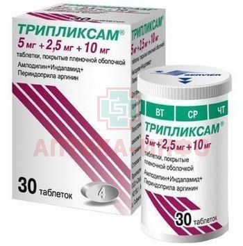 - Трипликсам® - комбинированный препарат, включающий в себя три антигипертензивных компонента, каждый из которых дополняет действие других по контролю артериального давления у пациентов с артериальной гипертензией. Амлодипин - блокатор "медленных" кальциевых каналов (БМКК), производное дигидропиридина, индапамид - сульфонамидный диуретик, периндоприла аргинин - ингибитор фермента, превращающего ангиотензин I в ангиотензин II (ингибитор АПФ).