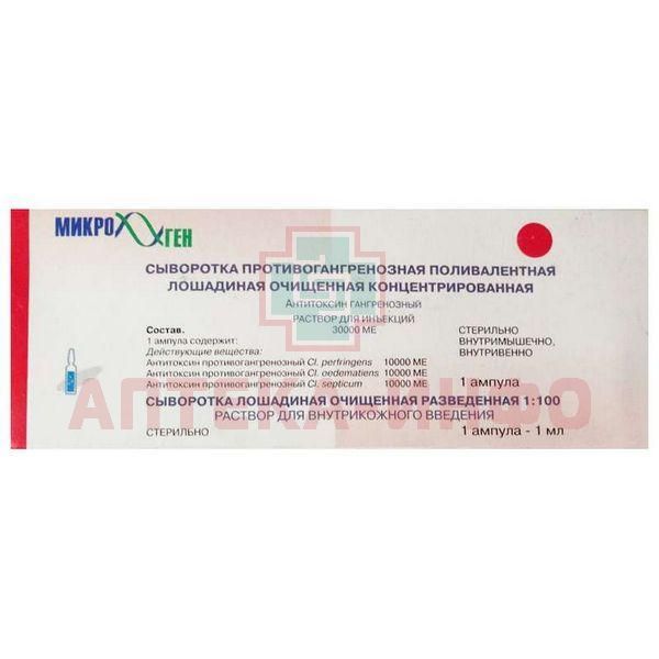 Сыворотка противогангренозная поливалентная лошадиная очищенная концентрированная жидкая амп.(р-р д/ин.) 30000МЕ 1 доза №1 уп.конт.пласт.(подд.) с сыв. лошад. разв. 1:100 амп. №1 Микроген НПО ФГУП МЗ РФ