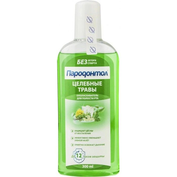 - ПАРОДОНТОЛ ОПОЛАСКИВАТЕЛЬ ДЛЯ ПОЛОСТИ РТА ЦЕЛЕБНЫЕ ТРАВЫ - Жидкость легкого бирюзового или зеленого оттенка с травяным ароматом.