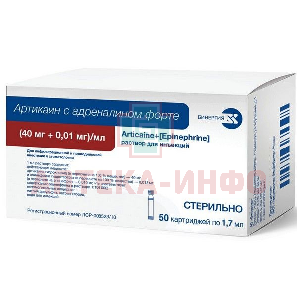 Артикаин с адреналином форте, применяемый для инфильтрационной и проводниковой анестезии в стоматологии, является комбинированным препаратом, в состав которого входит артикаин (местноанестезирующее средство амидного типа) и эпинефрин (сосудосуживающее средство), который добавляют в состав препарата для пролонгации анестезии.