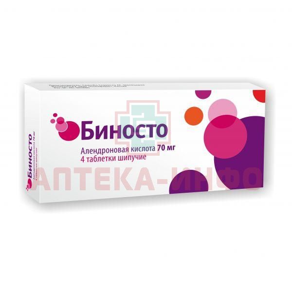 - Рекомендуемая доза - одна шипучая таблетка, 70 мг один раз в неделю. Пациентов следует предупредить, что, если они пропустят прием одной таблетки препарата Биносто 70 мг, они должны принять одну шипучую таблетку утром ближайшего дня. Не следует принимать две таблетки в один день, но в дальнейшем нужно продолжать принимать по одной таблетке в тот день недели, который был выбран для приема с самого начала лечения. Оптимальная длительность терапии остеопороза бисфосфонатами не установлена. Необходимость продолжения терапии бисфосфонатами должна оцениваться на регулярной основе на основании пользы/риска применения препарата Биносто для каждого пациента, особенно после 5 и более лет применения.