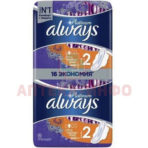 Гигиенические прокладки Always Platinum обеспечивают лучшее сочетание комфорта и защиты среди прокладок Always. Always Platinum более комфортны (по сравнению с Always Ultra) благодаря тысячам микроподушечек и новым, мягким как шелк крылышкам. Они также обеспечивают лучшую защиту (по сравнению с Always Ultra) благодаря защитным боковым барьерам и ультравпитывающему внутреннему слою, который запирает влагу внутри. Always Platinum Нормал Плюс (Размер 2) с крылышками рекомендованы для дневного использования при скудных и умеренных выделениях. Попробуйте Always Platinum Ночные (Размер 4) — лучшие гигиенические прокладки в линейке Always Platinum для защиты в ночное время. Лучшие комфорт и защита (в линейке Always Ultra)1000-чи мягких микроподушечек. Мягкие как шелк крылышки. Защитные боковые барьеры. Нейтрализуют неприятные запахи. Ультравпитывающий внутренний слой. Гигиенические прокладки не раздражают кожу (доказано дерматологами)