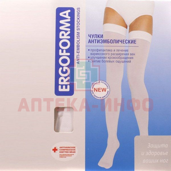 Антиэмболические чулки предназначены для использования во время оперативного вмешательства, во время родов и при длительной неподвижности больных при постельном режиме. Отличительными чертами антиэмболического трикотажа под торговой маркой Ergoforma являются возможность использования чулок в течение трех суток подряд без потери компрессионных свойств, а также возможность санации чулок в горячей воде. Широкая силиконовая резинка в области верхней трети бедра не оказывает чрезмерного давления на подлежащие ткани, а отверстие, расположенное под дистальным отделом стопы, способствует эффективному воздухо- и влагообмену.
