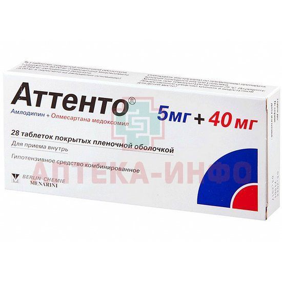 - Препарат Аттенто® - комбинированный гипотензивный препарат, в состав которого входят ангиотензина II рецепторов антагонист (АРА II) - олмесартана медоксомил и блокатор "медленных" кальциевых каналов (БМКК) - амлодипин. Комбинация двух действующих веществ обладает синергическим антигипертензивным действием, вследствие чего артериальное давление (АД) снижается в большей степени, чем при приеме каждого из них в отдельности.