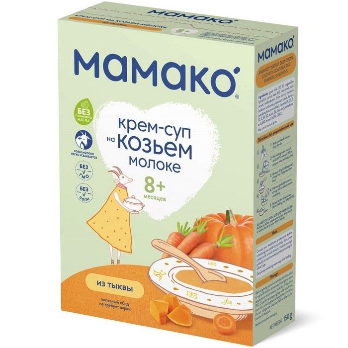 Сухой быстрорастворимый крем-суп из шпината на козьем молоке для питания детей старше 8 месяцев.Сухой быстрорастворимый крем-суп из шпината на козьем молоке для питания детей старше 8 месяцев.Специальные особенности:? Без пальмового и других добавленных растительных масел? Без соли? Без ГМО? Без крахмала? Без консервантов, красителей и ароматизаторовКрем-суп из тыквы МАМАКО® на козьем молочке легко приготовить, просто добавив теплой воды. Ароматный крем-суп из сладковатой мякоти тыквы приводит малыша в восторг. Предложите его в качестве первого на обед или как основное блюдо на ужин.• Суп из тыквы богат растительной клетчаткой, что способствует нормализации пищеварения. Тыква - чемпион по содержанию бета-каротина, железа, и других природных макро- и микроэлементов, поднимает настроение, положительно влияет на обмен веществ и укрепляет иммунитет.Пищевая ценность