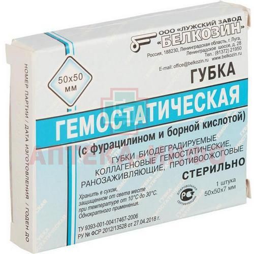 Губка гемостатическая коллагеновая губка(пластины) 5см х 5см х 7мм №1 Белкозин