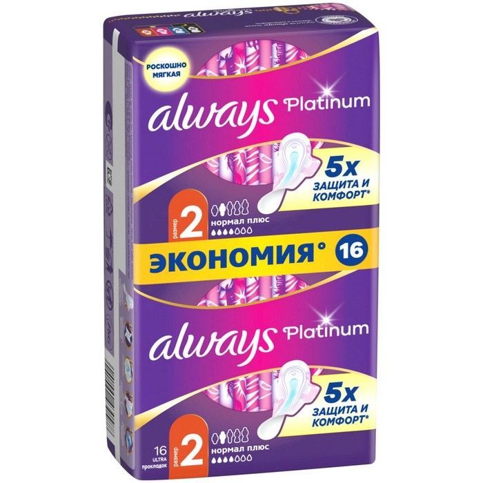 - Гигиенические прокладки ALWAYS Platinum нормал плюс (размер 2) одновременно обеспечивают большую мягкость и экстразащиту (по сравнению с ALWAYS Ultra). Благодаря 1000 мягких микроподушечек, действующих как боковые барьерчики, и внутреннему слою повышенной впитываемости ALWAYS Platinum - номер 1 для защиты и мягкости от ALWAYS. Технология нейтрализации запаха устраняет, а не маскирует запахи. Кроме того, ALWAYS Platinum всего 3 мм толщиной обеспечивают великолепную защиту и мягкость.