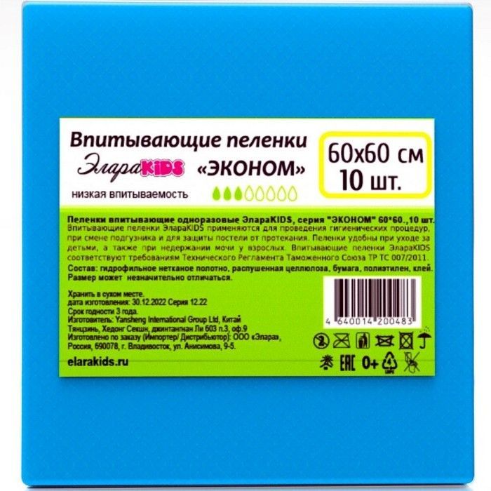 Пеленка ЭлараKIDS Эконом впит. 60 х 60см №10 Yansheng International Group Ltd/Китай
