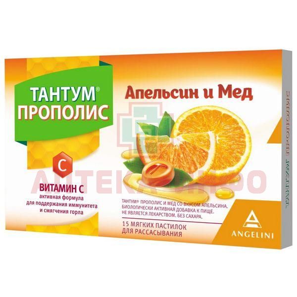 - БАД к пище Тантум® Прополис и мед со вкусом апельсина - это мягкие пастилки для рассасывания на основе натурального прополиса, обогащенные витамином С, медом и экстрактом куркумы для поддержания иммунной системы организма и смягчения горла.
