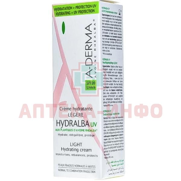 A-Derma Hydralba Light UV Cream (А-Дерма Гидральба Крем легкий увлажняющий UV) для нормальной и комбинированной кожи. У вас нормальная или смешанная кожа, но беспокоит ощущение сухости, появились морщинки обезвоженности, кожа лица утратила сияние? Ваша кожа нуждается в гидратации и защите от негативных факторов (весеннее и летнее солнце, стресс, изменения температуры, загрязненная среда и пр.), которые нарушают естественное увлажнение дермы. В этом поможет легкий увлажняющий Крем UV А-Дерма Гидральба. Средство идеально подходит для тусклой кожи с морщинками обезвоженности. Благодаря комплексу активных ингредиентов на основе экстракта овса сорта Реальба крем мгновенно увлажняет кожу и поддерживает баланс в течение длительного времени. Система солнцезащитных фильтров SPF 20/UVA 9 защитит от фотостарения и обезвоживания в солнечные дни весной и летом. Крем A-Derma Hydralba Light UV Cream обладает легким ароматом и приятной текстурой, содержит матирующие частицы.