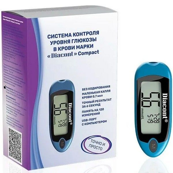 Измерение происходит всего за 6 секунд, при этом для анализа требуется только 0,7 мкл крови. Глюкометр Diacont (компакт) хранит в памяти 120 измерений, рассчитывает среднее значение за 7, 14, 21 и 28 дней, включается и выключается автоматически. Поставляется в комплекте с тест-полосками, ланцетами, устройством для получения капли крови, автоматическим скарификатором и футляром для хранения.