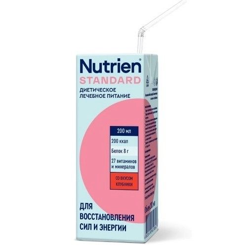 - Nutrien® Standard (Нутриэн® Стандарт) со вкусом клубники, лечебное (энтеральное) питание - жидкая готовая смесь объемом 200 мл в упаковке Tetra Pak . К упаковке прилагается одноразовая стерильная трубочка.