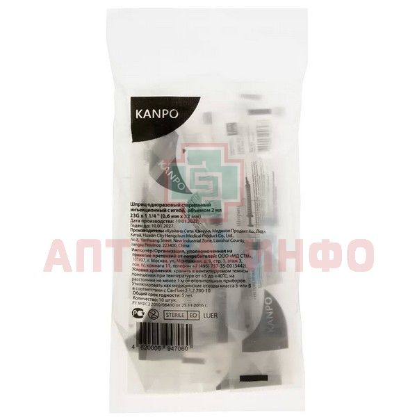 Шприц одноразовый KANPO (КАНПО) 2мл (3-х комп.) 23G (игла 0,6х32) №10 Shandong Weigao Group Medical Polymer/Китай
