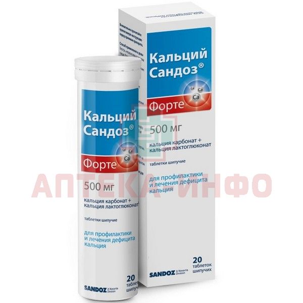 - Кальций Сандоз® Форте содержит две соли кальция (кальция лактоглюконат и кальция карбонат), которые в форме таблеток шипучих быстро растворяются в воде, превращаясь в активную ионизированную форму кальция, которая легко усваивается.