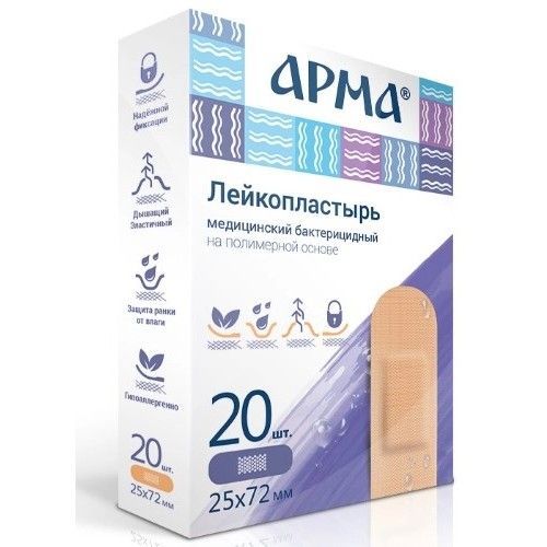 - Медицинский бактерицидный лейкопластырь «Арма» используют в качестве наружного антисептического перевязочного средства при небольших порезах, ссадинах, царапинах и других мелких повреждениях кожи.