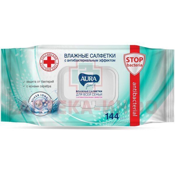 Салфетки AURA Family влажн. антибактериальные №144 с крышкой Коттон клаб/Россия