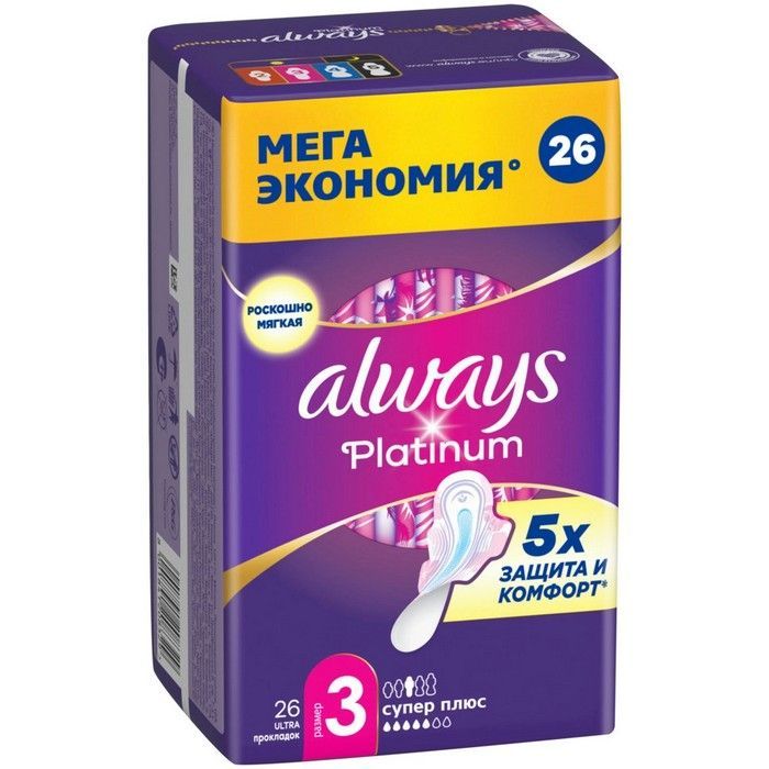 - ALWAYS ПРОКЛАДКИ PLATINUM ULTRA SUPER PLUS - гигиенические прокладки Always Platinum обеспечивают лучшее сочетание комфорта и защиты среди прокладок Always.