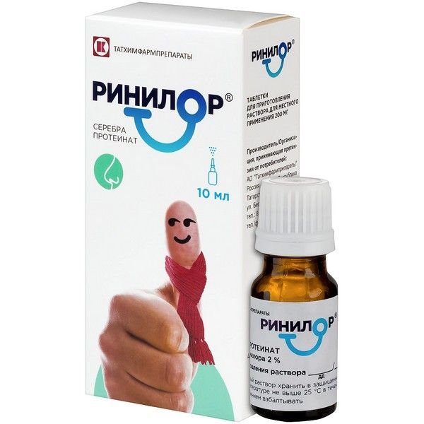 - Фармакодинамическое, фармакокинетическое взаимодействие: не изучено. Фармацевтическое взаимодействие: соли цинка, меди, свинца, серебра, ртути, железа, алюминия образуют с раствором серебра протеината нерастворимые осадки; раствор серебра протеината инактивируется солями алкалоидов и органическими основаниями (эпинефрин). Если вы применяете вышеперечисленные или другие лекарственные препараты (в том числе безрецептурные) перед применение препарата РИНИЛОР® проконсультируйтесь с врачом.