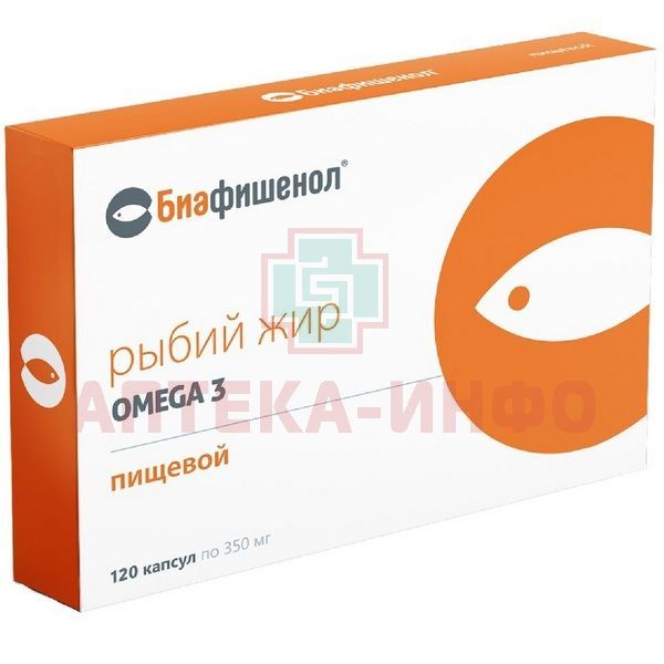 - 100% рыбий жир в капсулированном виде. Препарат содержит ценные полиненасыщенные жирные кислоты. Регулярный прием рыбьего жира Биафишенол пищевой способствует снижению риска инсульта, ишемии, атеросклероза и других сердечно-сосудистых патологий, также способствует значительному понижению уровня холестерина.