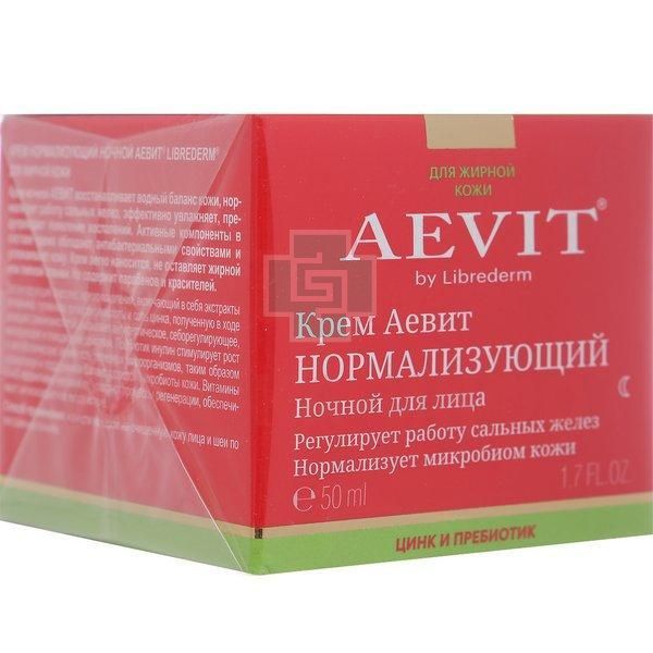 Бренд LIBREDERM - международный бренд косметики, который предлагает современные решения для любой дерматологической потребности. Коллекция АЕВИТ® - сила витаминов для красоты кожи Обогащенная витаминами и растительными экстрактами формула средств Аевит питает кожу, защищает от сухости, способствует регенерации и сохраняет молодость кожи. Крем нормализующий ночной АЕВИТ® - Крем нежной текстуры легко наносится и быстро впитывается, не оставляет жирной или липкой пленки. Активные ингредиенты - Пребиотик инулин стимулирует рост и метаболическую активность полезных микроорганизмов, нормализуя и поддерживая баланс здоровой микробиоты кожи. - Балансирующий комплекс нового поколения, включающий в себя экстракты репейника, гулявника, ?-гидроксикислоты и соль цинка, полученную в ходе реакции с аминокислотой, оказывает антисептическое, себорегулирующее, матирующее и очищающее действия. -Витамины А и Е эффективно увлажняют, ускоряют процессы регенерации, обеспечивают антиоксидантное воздействие.
