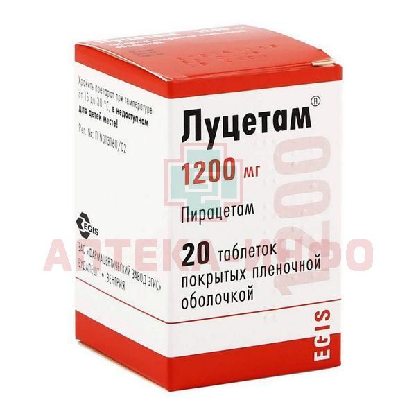 ЛУЦЕТАМ таблетки покрытые пленочной оболочкой 1200 мг: по 20 и по 60 таблеток покрытых пленочной оболочкой во флаконе из коричневого стекла, с полиэтиленовой крышкой с контролем первого вскрытия. 1 флакон вместе с инструкцией по применению упаковывают в картонную пачку. По 10 таблеток в блистере из ПВХ/ПВДХ//ал.фольги. В картонную пачку упаковывают 2 блистера вместе с инструкцией по применению.