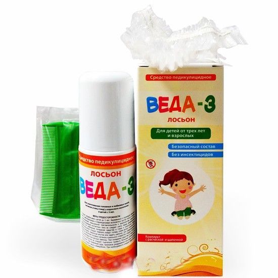В состав набора входят: лосьон Веда-3, флакон 100 мл, шапочка (для комфортного пребывания со средством на голове), расческа (для вычесывания погибших гнид).Меры предосторожности: