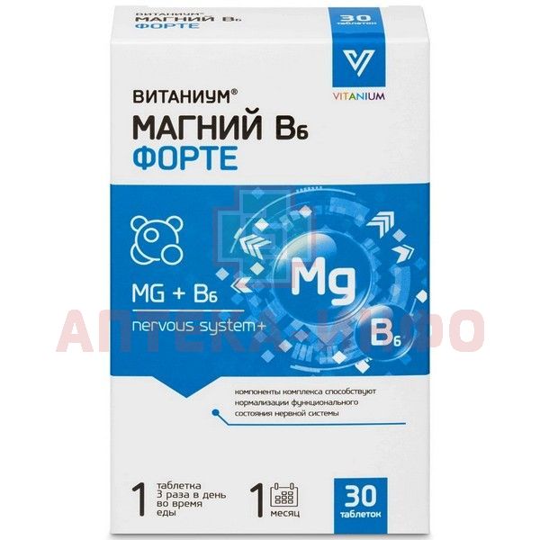 - Комплекс «Магний В6 Форте ВИТАНИУМ ®» - оптимальное сочетание компонентов с доказанным действием на нервную систему - цитрата магния и нейропротективных витаминов В2, В6 и В12 - для поддержания здоровья нервной системы, лучшей адаптации в периоды психоэмоциональных перегрузок и стрессов, нормализации эмоционального фона, сохранения спокойствия, работоспособности и здорового сна.