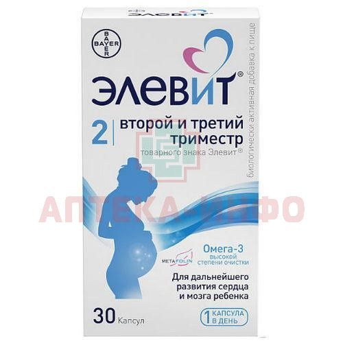 Элевит® 2 - Второй и Третий Триместр т.з. Элевит® БАД к пище. Рекомендовас со 2-го триместра беременности и до рождения ребенка. Содержит 12 витаминов и 6 микроэлементов, а также омега-3 высокой степени очистки в 1 капсуле. Способствует дальнейшему развитию сердца и мозга ребенка.