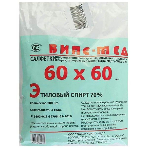 - Прединъекционные салфетки СПДс-«ВИПС-МЕД» (СПДс-В-М) - одноразовые спиртовые салфетки предназначаются для обработки кожи в целях снятия первичного загрязнения с неповрежденных участков тела непосредственно до и после инъекции и применяются в медицинских учреждениях и домашних условиях.