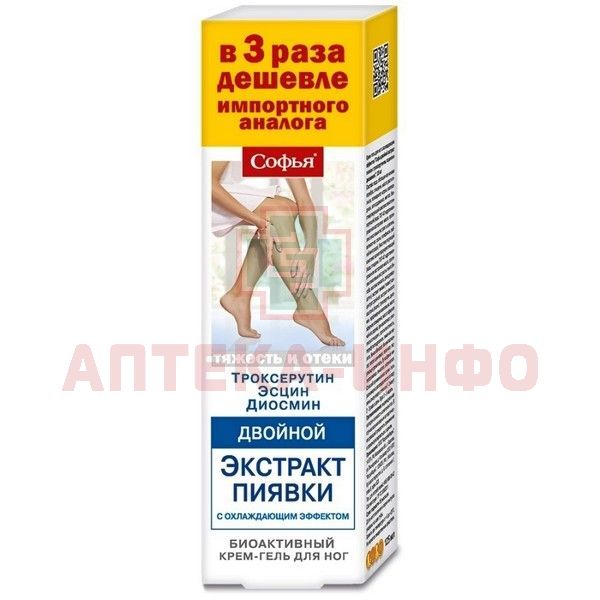 - Крем-гель для ног с охлаждающим эффектом "Софья двойной экстракт пиявки с троксерутином, эсцином и диосмином" - натуральное эффективное средство, давно заслужившее доверие у миллионов российских женщин