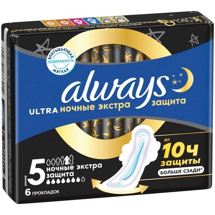 - Наслаждайтесь спокойным сном благодаря тройной защите: гигиенические прокладки ALWAYS Ultra Secure Night (ночные экстра защита) с крылышками обеспечивают тройную защиту от протеканий и необходимости менять прокладку ночью.