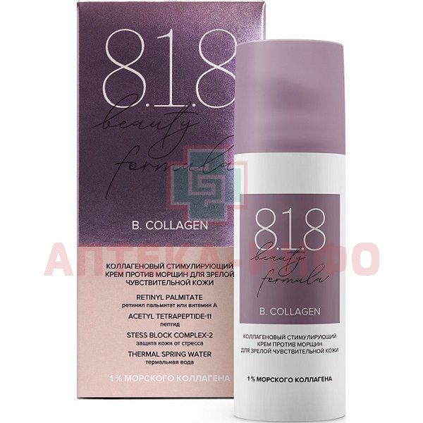 8.1.8 beauty formula - трехфазная система профилактики и защиты кожи от стресса. Создана для чувствительной кожи женщин мегаполиса, испытывающих дефицит сна и отдыха. Формула восстановления эпидермального ресурса и омоложения кожи: 8 часов сна + 1 час ухода за собой + 8 активных компонентов. Коллагеновый стимулирующий крем против морщин для зрелой чувствительной кожи способствует повышению плотности и эластичности кожи. Корректирует признаки возрастных изменений. Активизирует собственные ресурсы кожи. Является идеальной основой под макияж.- ГИДРОЛИЗОВАННЫЙ МОРСКОЙ КОЛЛАГЕН в концентрации 1 % стимулирует выработку собственного коллагена в коже и восстанавливает ее, делая более гладкой и упругой.