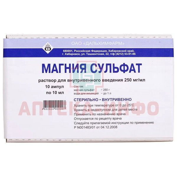 Магния сульфат амп.(р-р д/в/в введ.) 250мг/мл 10мл №10 (5х2) Дальхимфарм