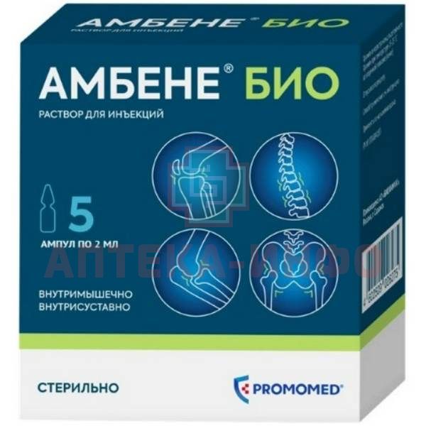 - АМБЕНЕ® Био предотвращает разрушение макромолекулярных структур нормальных тканей, стимулирует процессы восстановления в интерстициальной ткани и ткани суставного хряща, что объясняет его обезболивающее действие. Противовоспалительное действие и регенерация тканей основаны на угнетении активности гиалуронидазы и нормализации биосинтеза гиалуроновой кислоты. Оба эти эффекта синергичны и обуславливают активацию восстановительных процессов в тканях (в частности, восстановление структуры хряща).